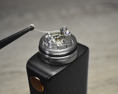 Сначала попробуем запустить атом на тех спиралях, что имеются в комплекте. Для этого нам понадобится снять колечко, затем выкрутить пару винтов на стойках. И сталкиваемся с первой трудностью – ставить койлы теперь не так удобно, так как мешается ограничитель испарительной камеры, из-за чего приходится ножки заранее подгибать.