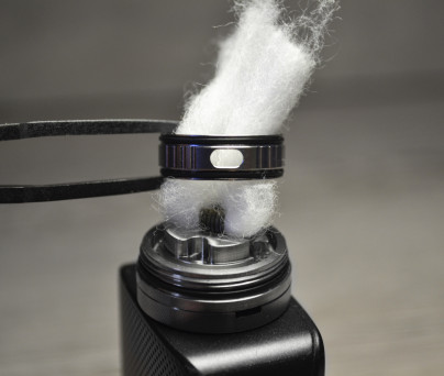 Ставим вату, тут этот процесс малость специфичный. Сначала ее потребуется завести внутрь спирали, а после этого концы поднять вверх, словно кроличьи ушки, и надеть сверху кольцо. В качестве ватки используем знаменитый «Бекон», но можно и любую другую, проблем с жижеподачей тут быть не должно.