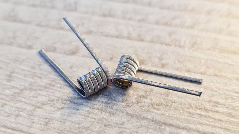 Спиральки здесь неплохие, это Fused Clapton'ы из нихрома. Сопротивление каждой 0.4 Ома – то есть в итоге получим 0.2 Ома на готовой намотке. Хлопка хватит на два раза, он здесь в виде шнурочков с запрессованными наконечниками, устанавливать удобно, за это плюс.