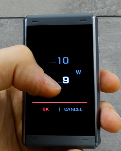 Как видим, из информации имеются мощность, напряжение, текущее сопротивление намотки, время затяжки, а также токоотдача. Все управление основывается на жестах и прокрутках: чтобы сменить режим, достаточно провести пальцем влево или вправо. Набор таков: